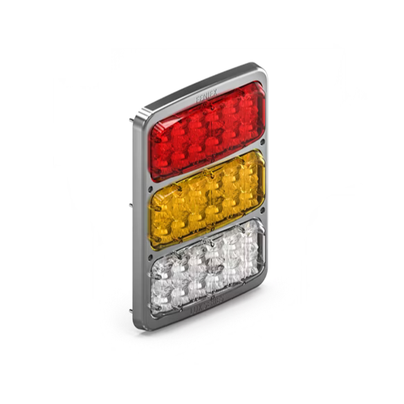 The Feniex 3-Up Brake Tail Turn Reverse is a comprehensive perimeter mount that integrates all essential DOT functions, including brake light, tail light, turn signal, and reverse lighting modes. Each of the three Lux units is equipped with optics uniquely angled for its specific purpose; for instance, turn signals are designed with 180° visibility to ensure they are seen from all angles. Featuring three Lux surface mounts within the same bezel, the 3-Up offers maximum traffic signaling in a highly compact form.