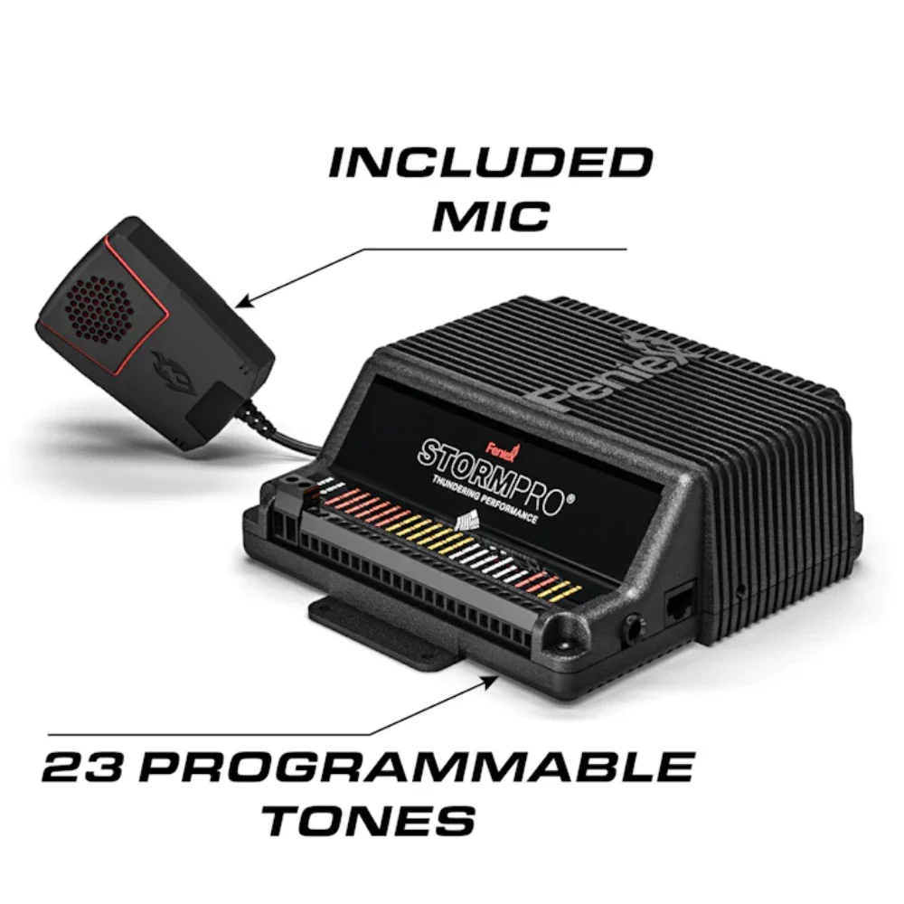 Integrated with essential features including a horn ring, radio rebroadcast, park kill, PA function, and a selection of 19 tones, the Storm Pro is designed to meet diverse operational needs. Choose from twenty-three programmable tones, tailored for pursuit and emergency response vehicles. Its remote activation capability ensures universal compatibility, even with non-Feniex controllers, enhancing operational flexibility.