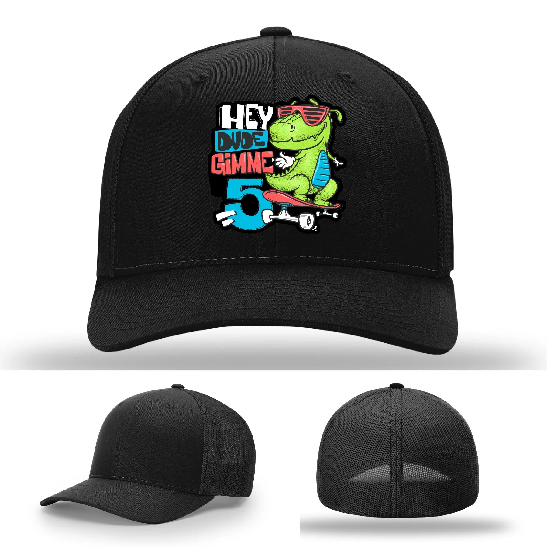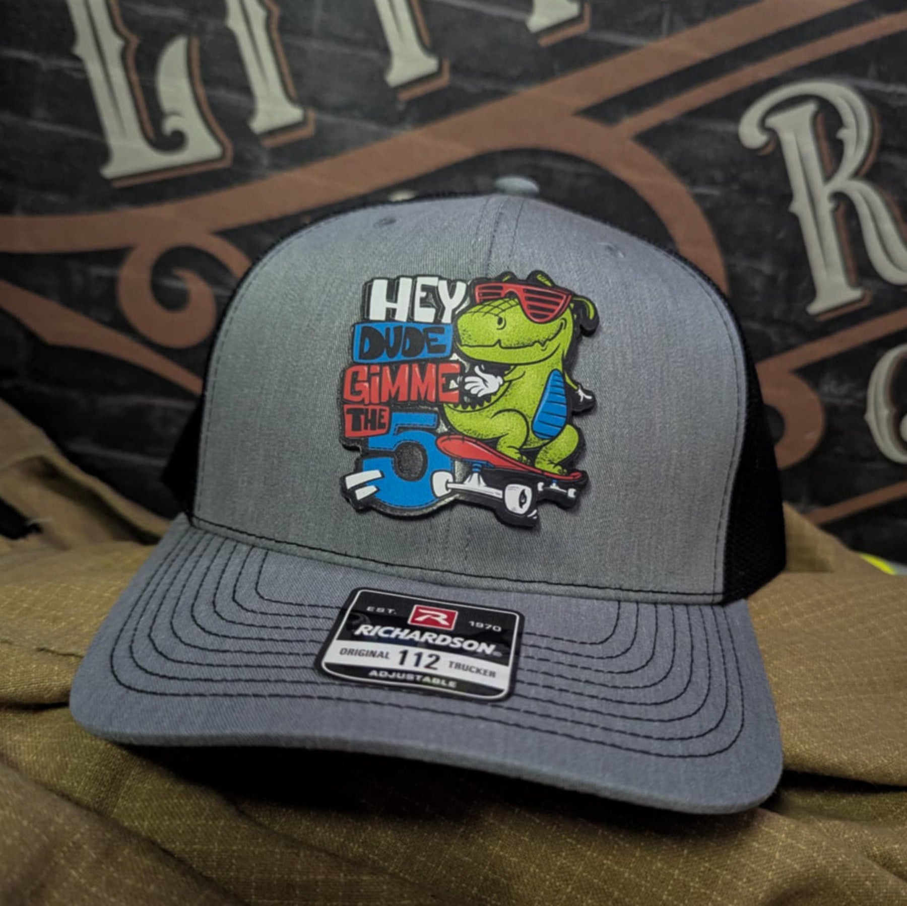 Bring the fun wherever you go with the Gimme 5 Leather Patch Hat—a perfect mix of retro skate vibes, bold style, and handcrafted quality. This hat features a full-color leather patch with a sunglasses-wearing T-Rex, rolling on a skateboard with a snack in hand, shouting the classic line: “Hey dude, gimme 5!” It’s playful, loud, and guaranteed to turn heads.
