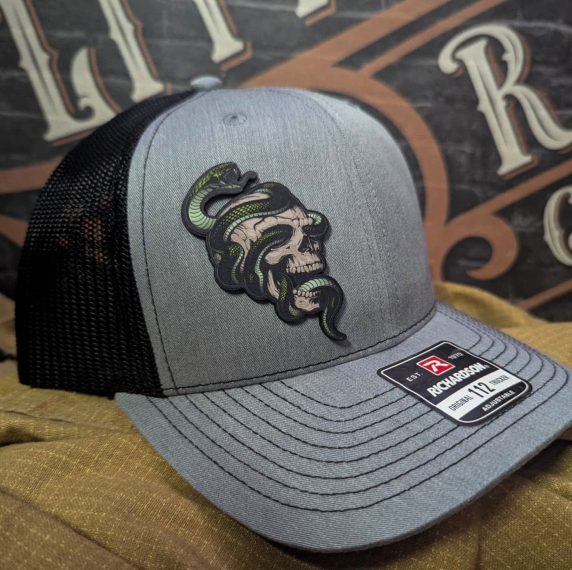 Dark. Twisted. Clean. The Serpent Skull Leather Patch Hat is built for those who want their gear to hit harder than words. A venomous green snake coils through a weathered skull, pressed in high-definition detail onto real full-grain leather. It’s more than a patch — it’s an attitude.