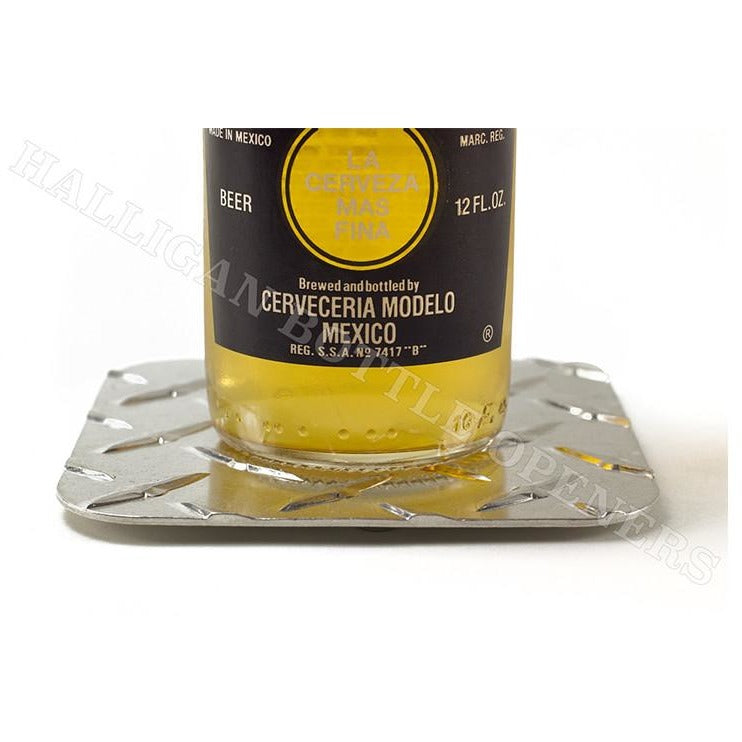 Now that you forced open your favorite beer with one of our rugged bottle openers, keep the rings off the table. Stamped from 1/16″ aluminum diamond plate, these coasters were built to last. Each coaster has 4 rubber feet to keep your table safe from scratches.
