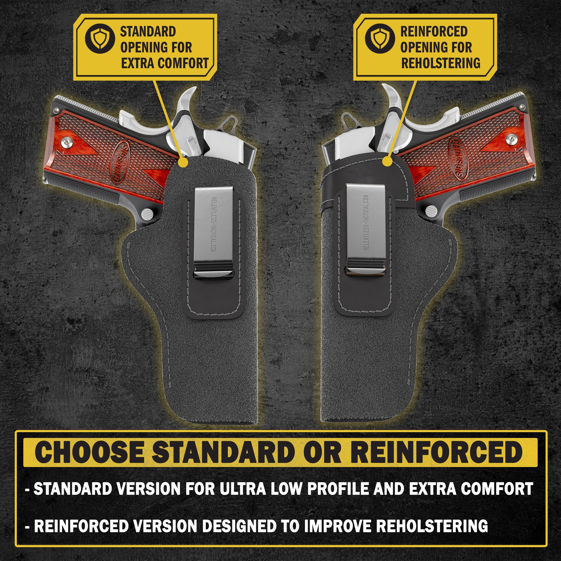 The firearms you carry are indispensable, and will be needed at a crucial time. You can't afford to trust a flimsy, undependable holster. Feel confident wearing The Ultimate Suede Leather IWB Holster from Relentless Tactical.