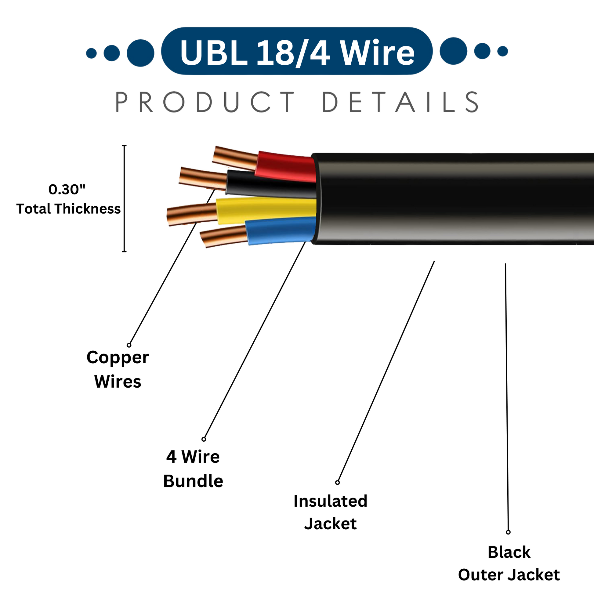 The UBL 18/4 Wire is meticulously crafted with four copper wires, an insulated jacket, and a durable black outer jacket. Measuring 0.30" in total thickness, this wire meets stringent testing standards to ensure exceptional flexibility, high conductivity, oxidation resistance, and windproof performance. Designed to handle up to 300V, the UBL 18/4 Wire operates effectively within a temperature range of -30°C to 80°C. Featuring a high strand count, this wire offers superior flexibility and uses low-resistance tinned copper for optimal conductivity. Ideal for automotive applications, the UBL 18/4 Wire is perfect for both upgrades and repairs, providing reliable performance for your vehicle's wiring needs.