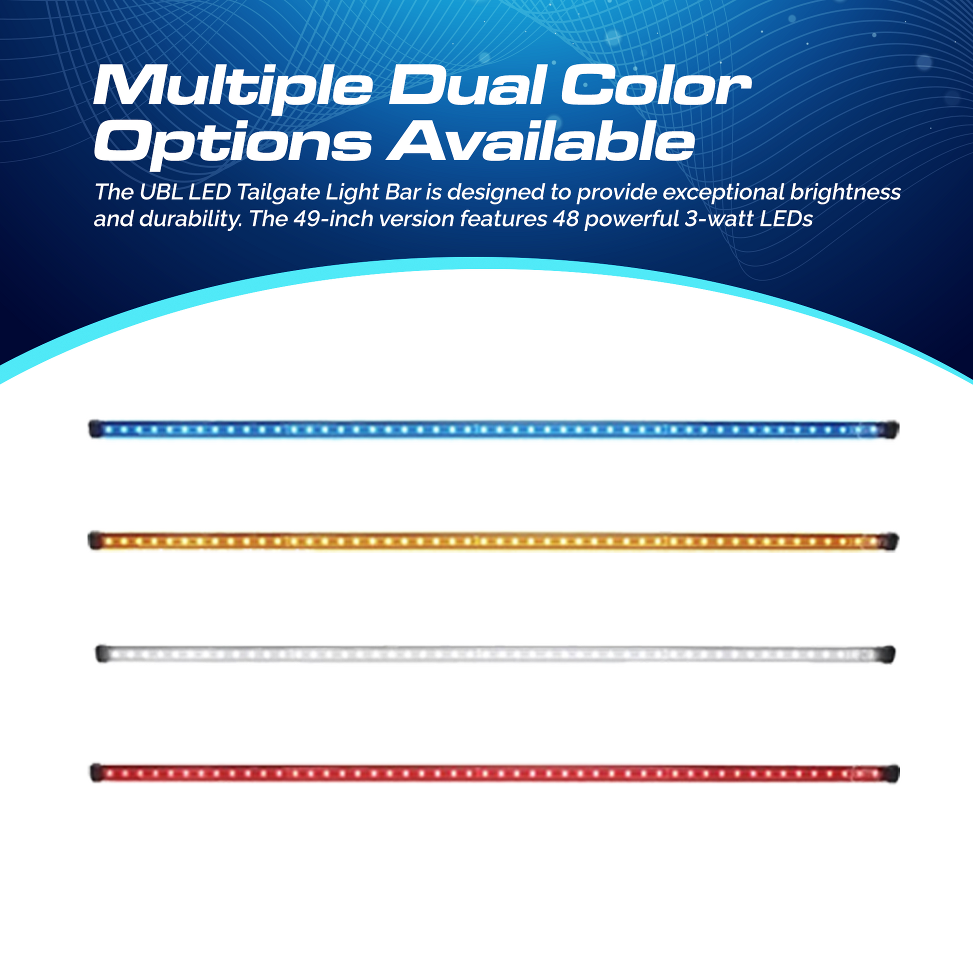 Elevate your truck's visibility and style with the UBL LED Tailgate Bar, available in two sizes to fit a range of truck models. The standard 49-inch tailgate bar is perfect for mid-sized trucks such as the Chevy Colorado, Toyota Tacoma, and Ford Ranger. For larger trucks like the Chevy Silverado, GMC Sierra, Ram, and Ford F-Series, the 60-inch tailgate bar is the ideal choice.