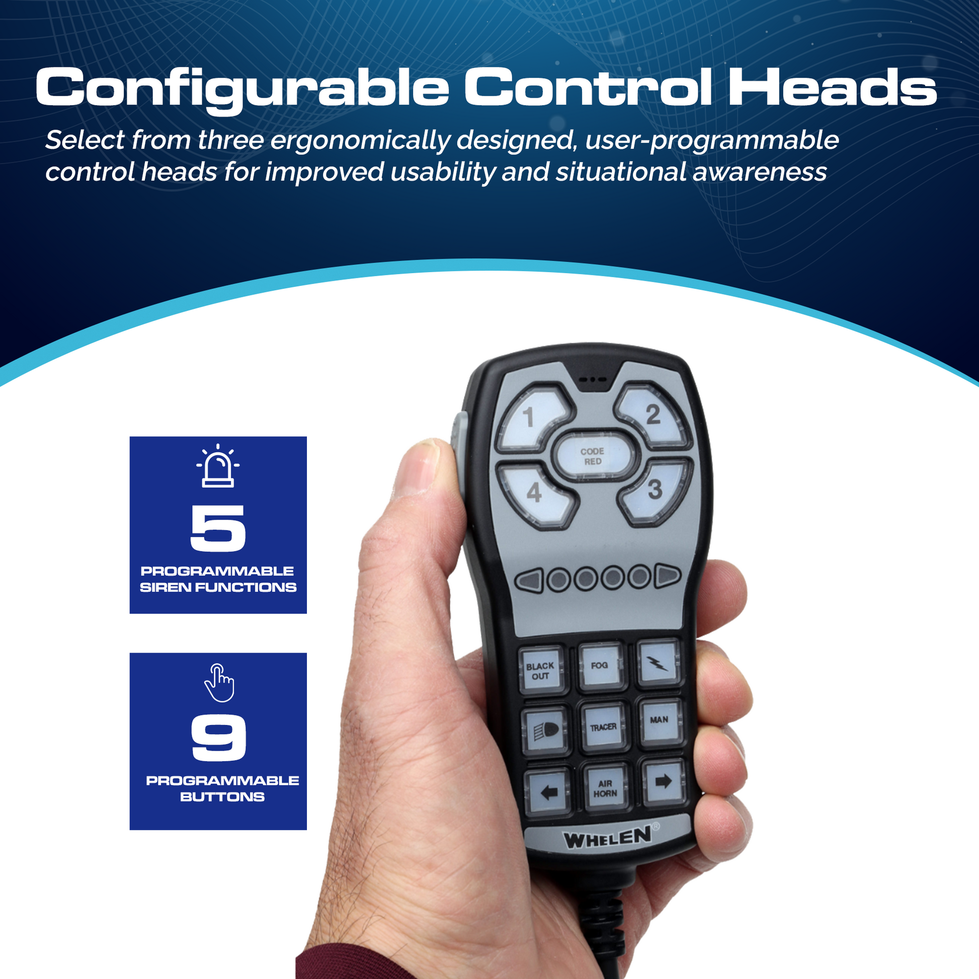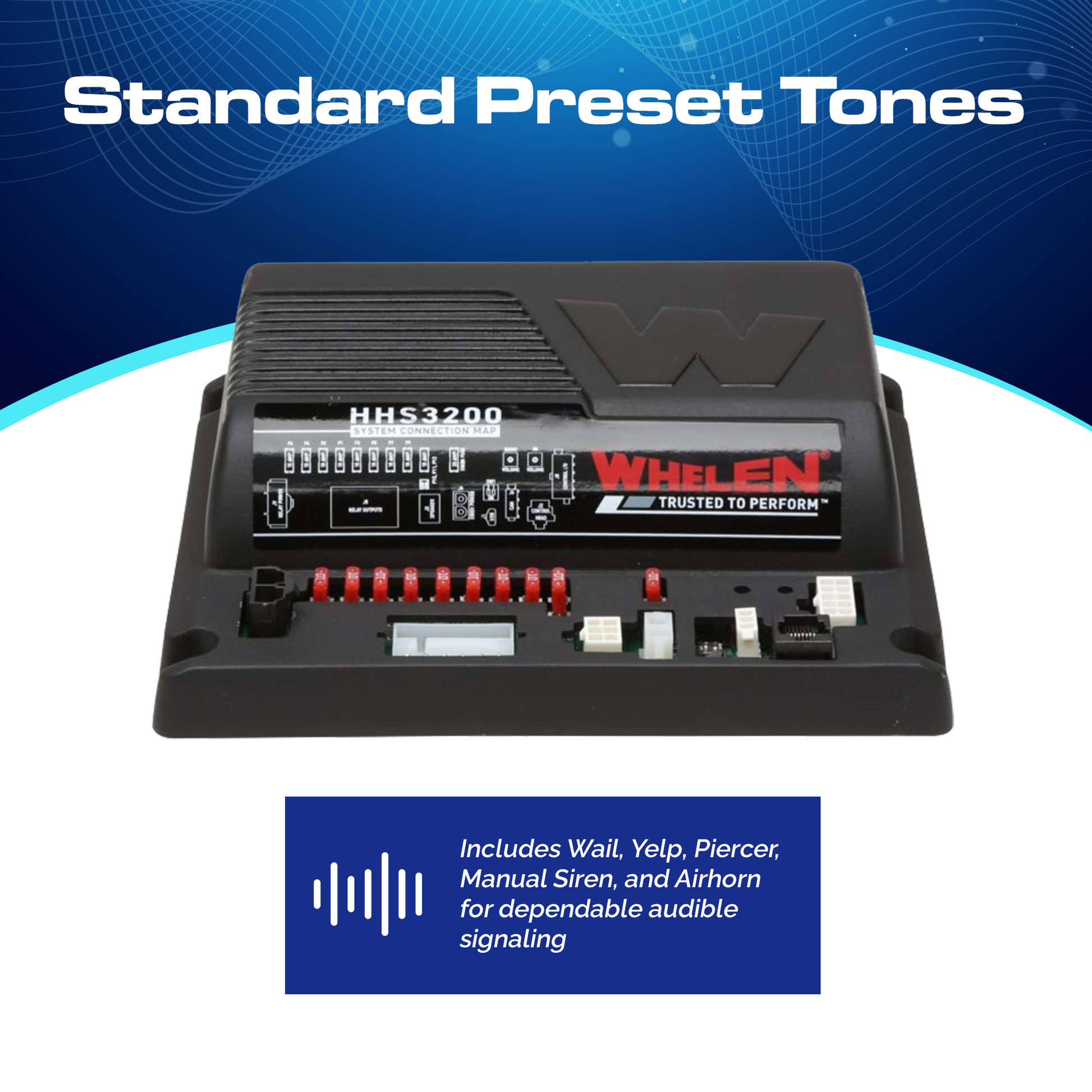 Discover the enhanced Whelen HHS 3200 Handheld Siren, featuring a redesigned amplifier housing for increased durability and reliability. This versatile siren system includes a handheld controller equipped with five programmable siren functions and nine programmable buttons to control your lights and other emergency warning equipment with precision.